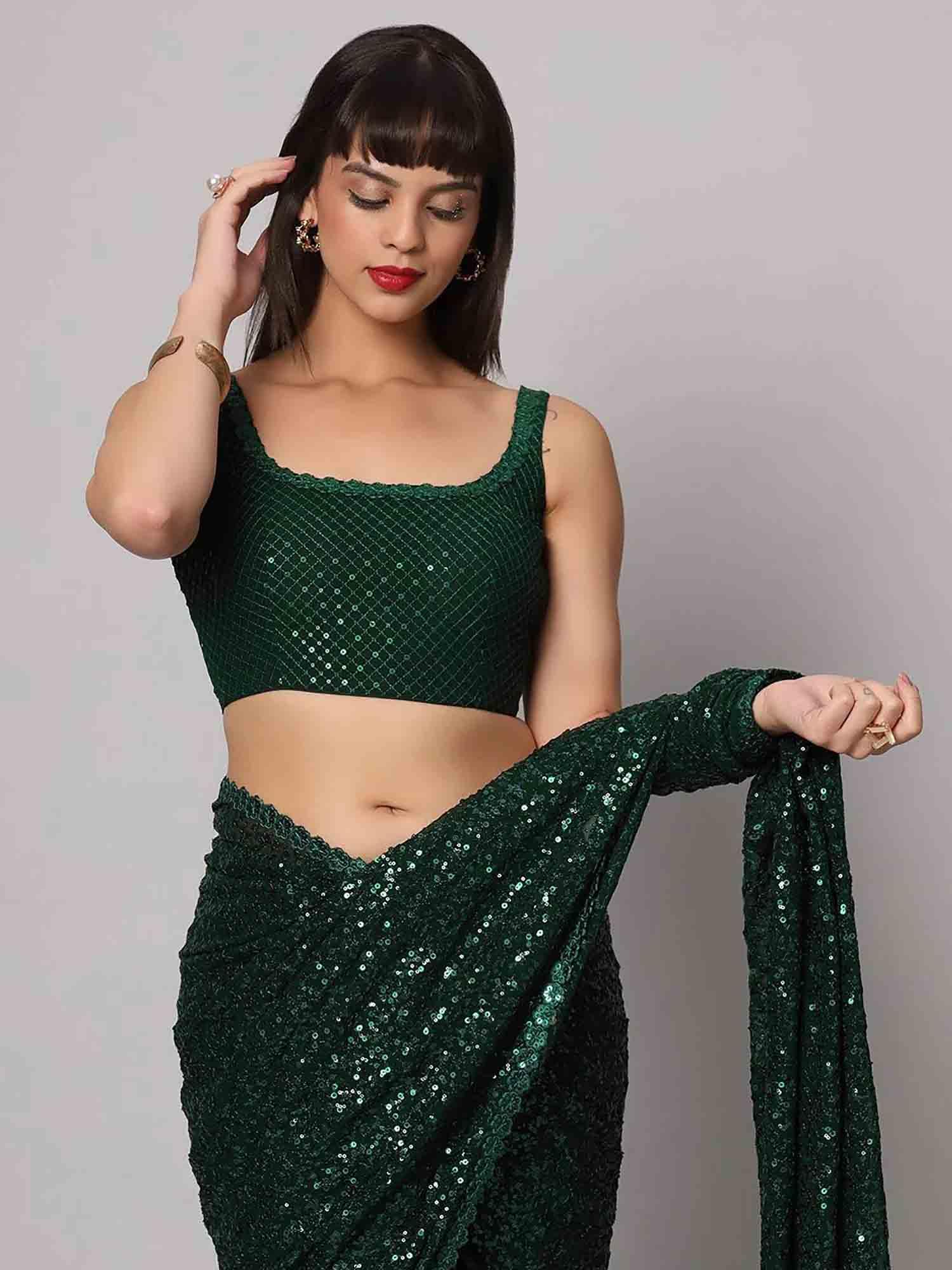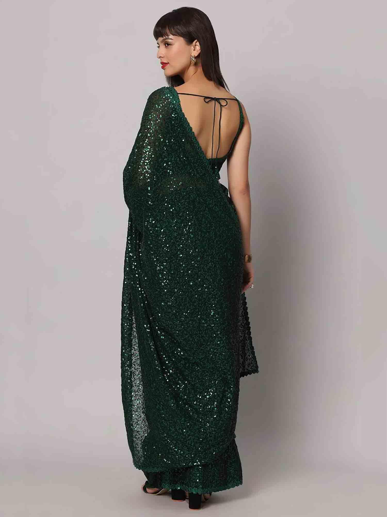 Zeel Clothing Women's Dark Green Sequins Work Heavy Georgette Saree with Blouse (1008-Deep-Green-Sequins-Party-Saree-New, Deep Green)