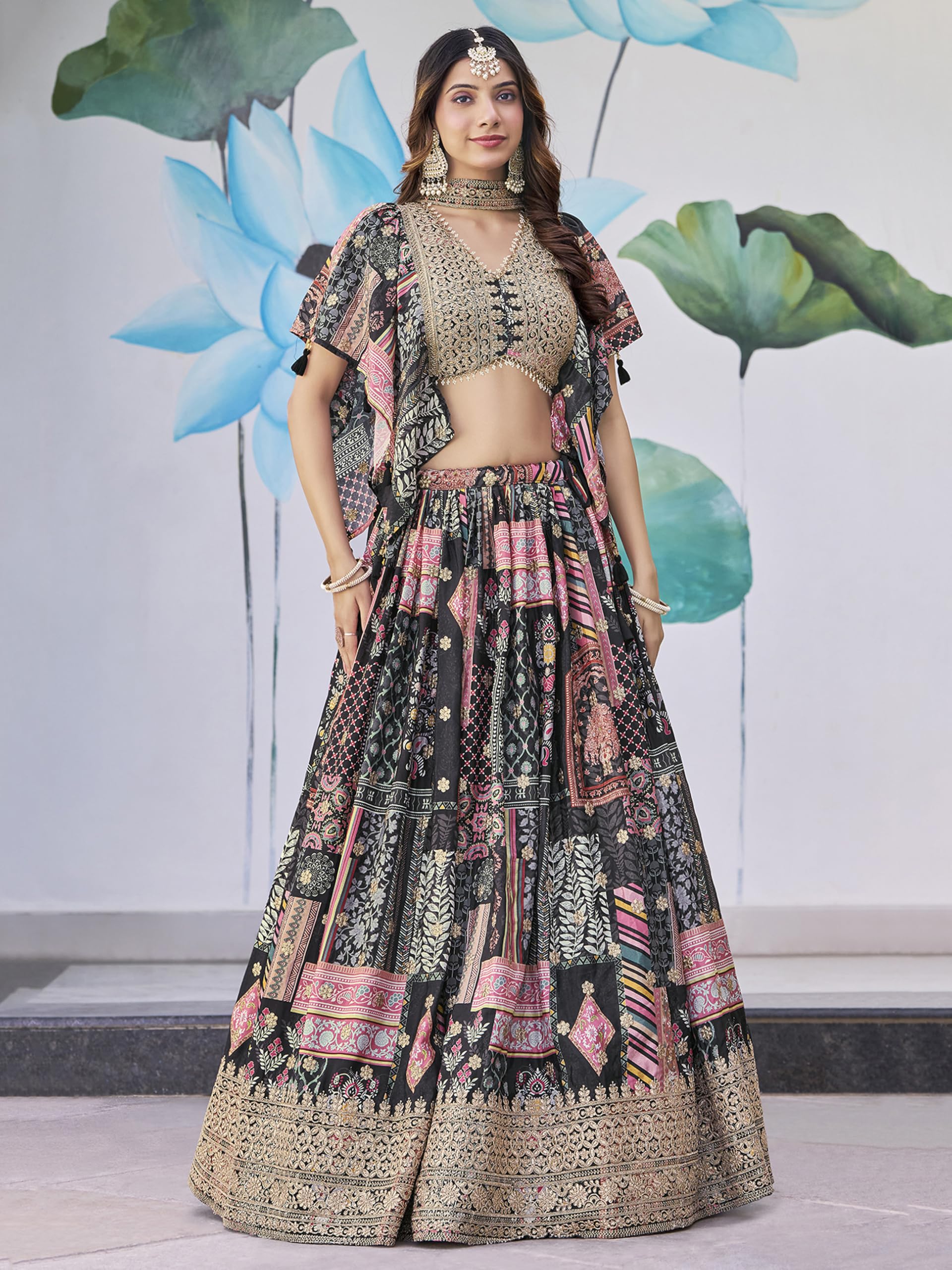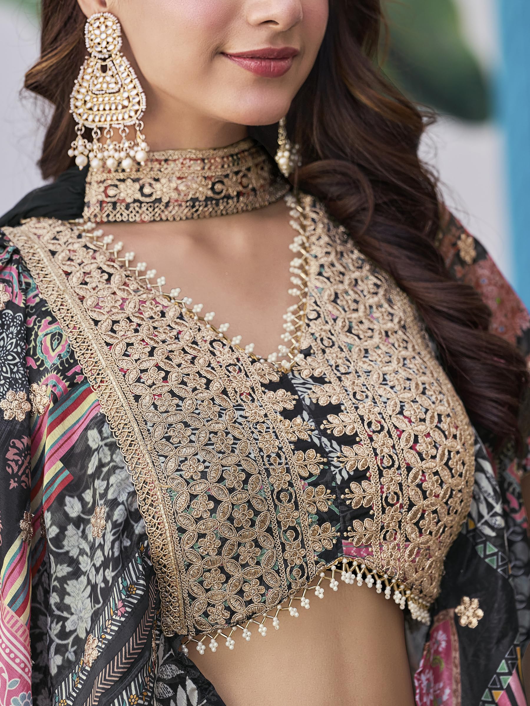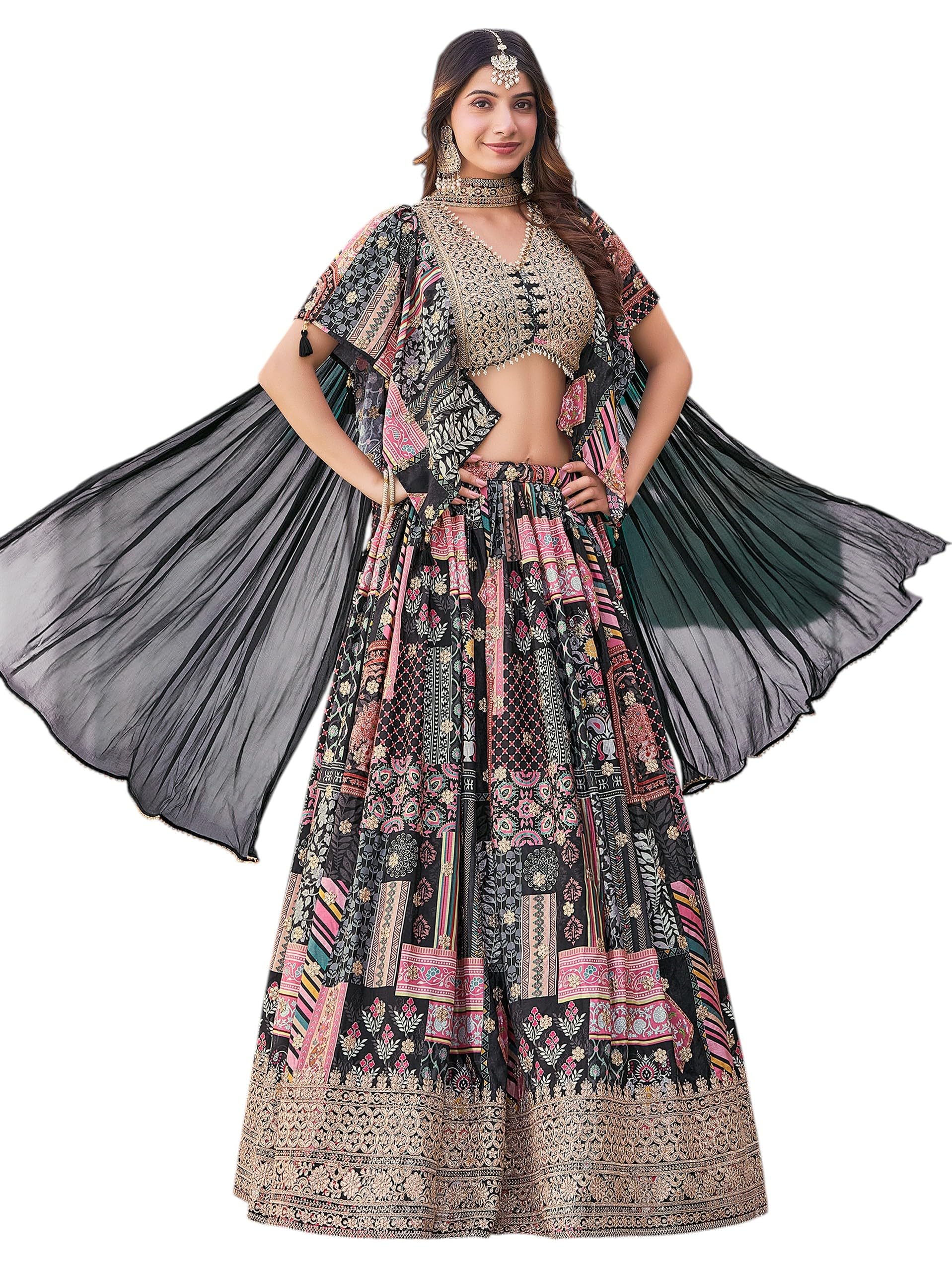 Zeel Clothing Women's Digital Print with Zari Dori Embroidery Work Chinnon Silk Lehenga Choli With Dupatta (7050-Black-Women-Lehenga-Choli-Latest; Free size) (Black)