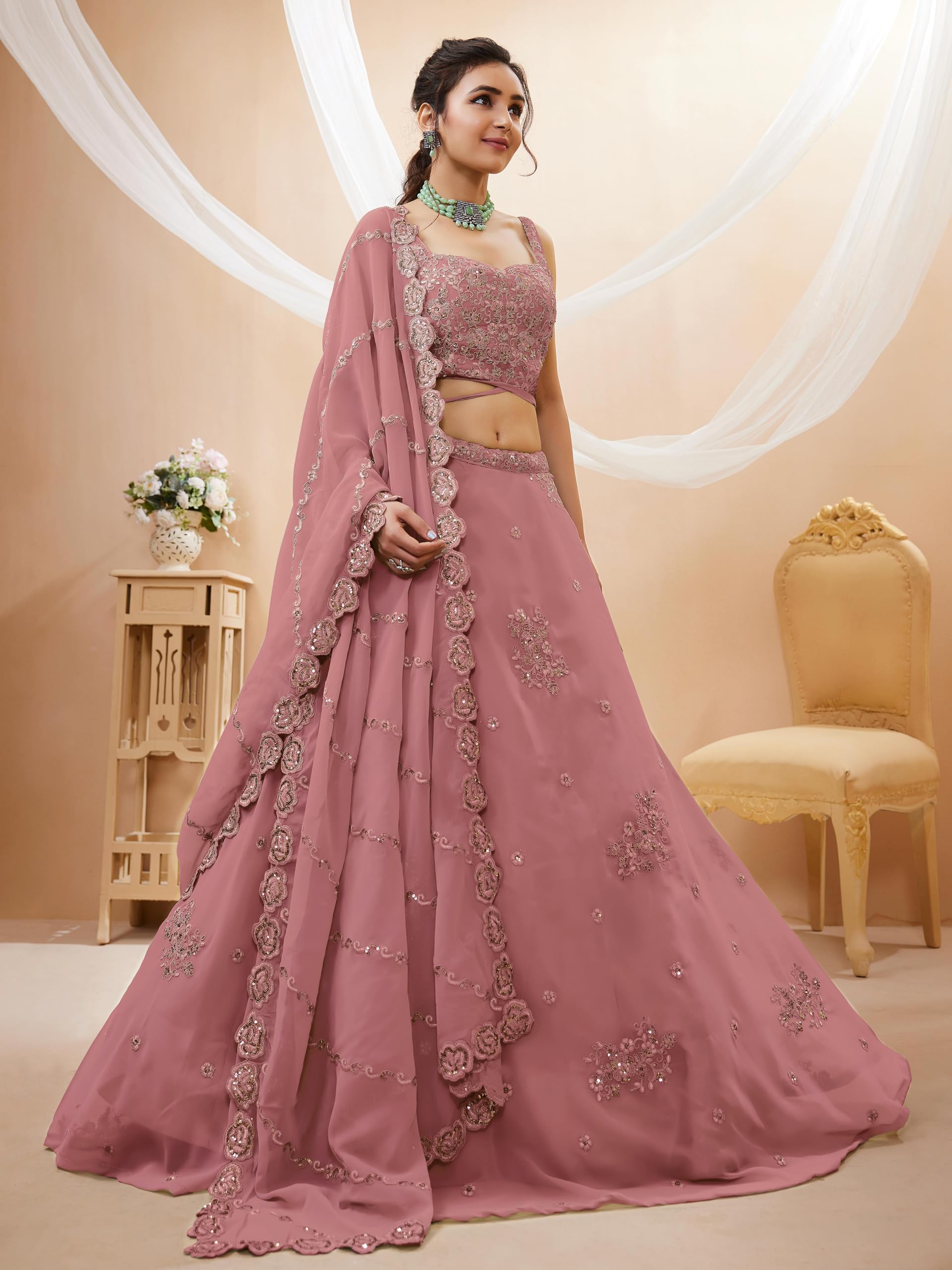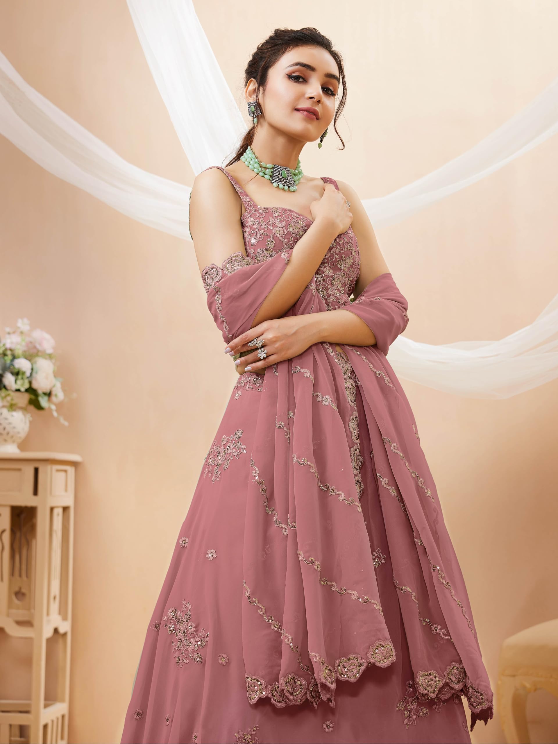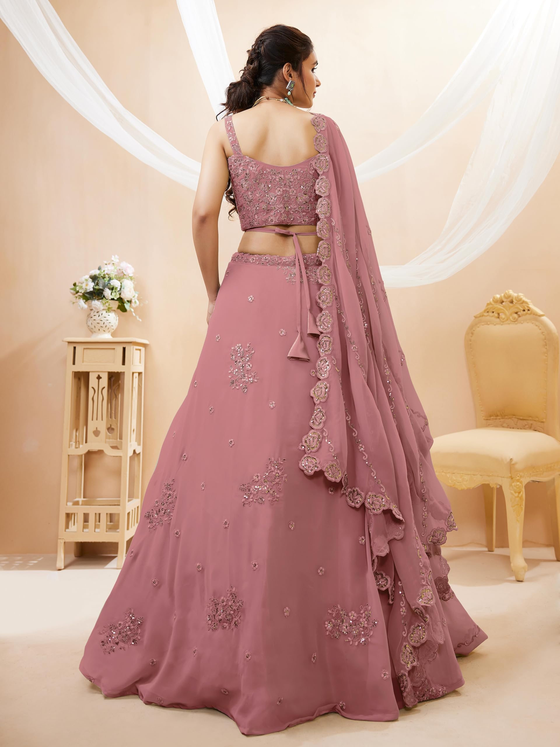 Details: If you are a diva who loves to turn heads wherever you go and this stunning peach colored partywear lehenga choli. The lehenga is made of georgette fabric that has been enhanced with lovely heavy embroidery with sequins and dori embellishments which makes this outfit perfect for any occasion. Comes along with unstitched heavy embroidered georgette blouse piece and embroidered matching georgette dupatta to complete the look.