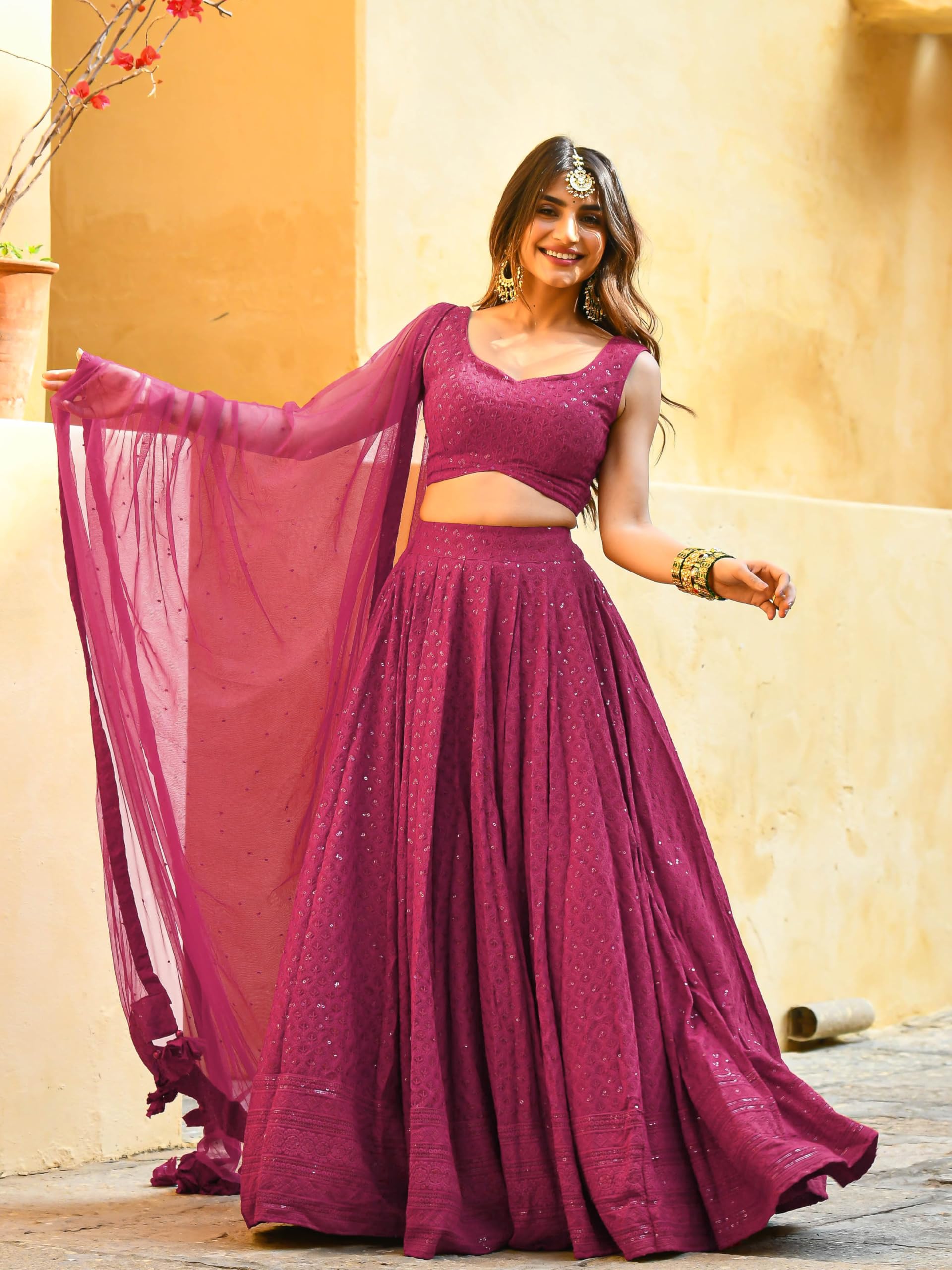 - Lehenga Work: Sequins Thread Embroidered; Blouse Work: Sequins Thread Embroidered; Dupatta Work: Sequins Thread Embroidered