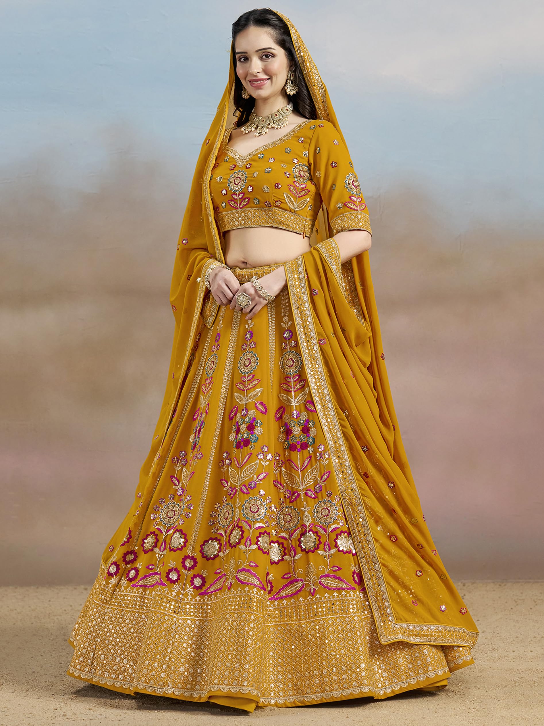 Zeel Clothing Women's Sequins Thread Embroidered Georgette Lehenga Choli With Dupatta (6008-Yellow-Women-Lehenga-Choli-New; Free Size)(Yellow)