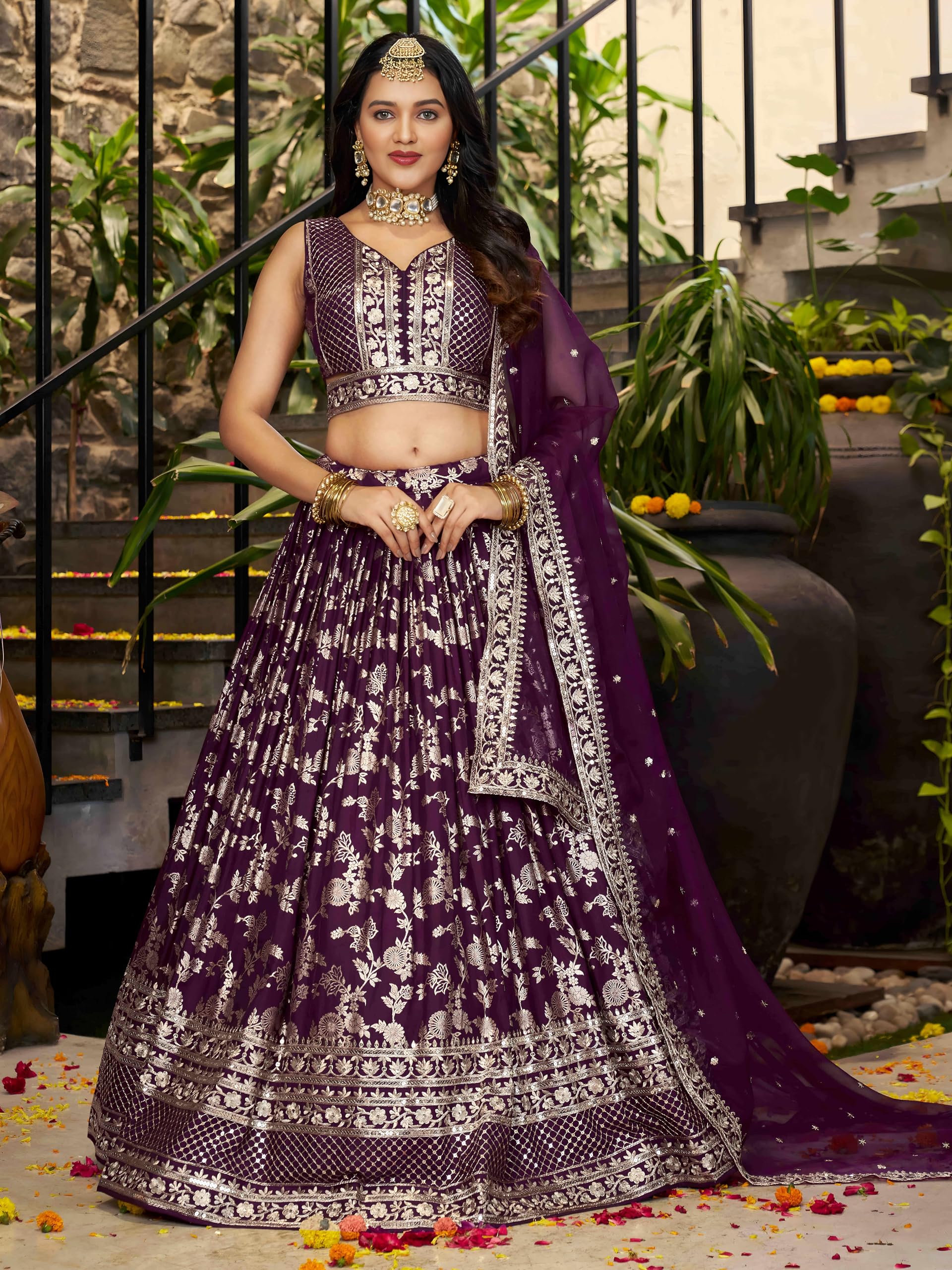 Zeel Clothing Women's Sequins Zari Embroidered Dola Silk Jacquard Lehenga Choli With Dupatta (7100-Women-Lehenga-Choli-Latest, Free size) (Wine)