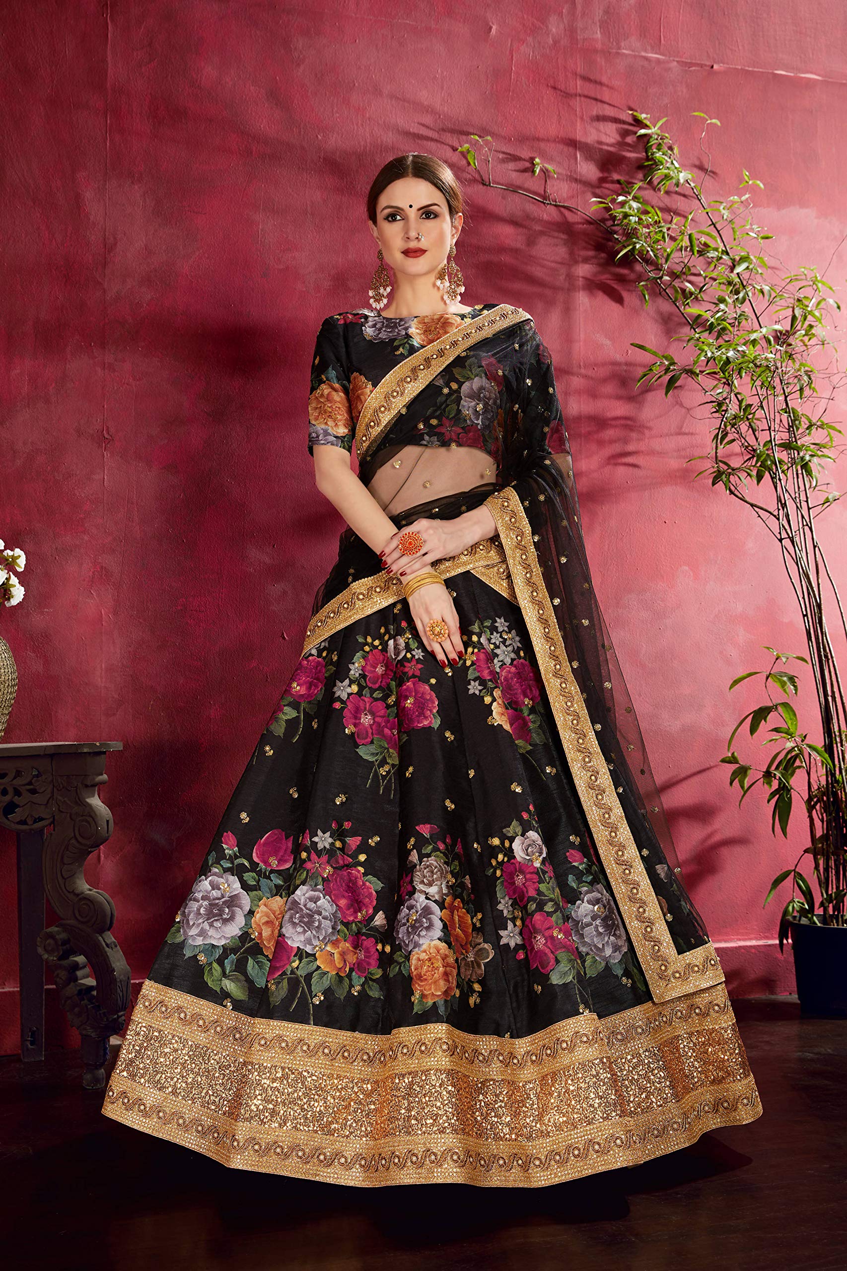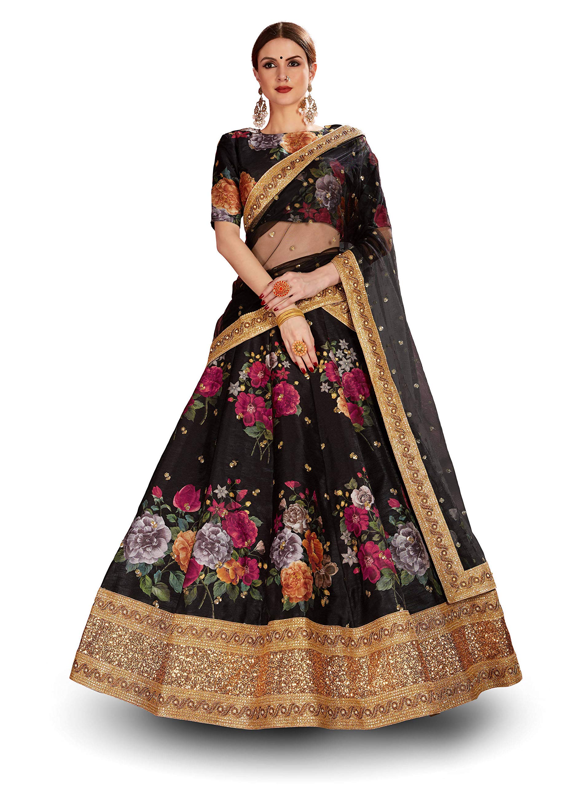 Zeel Clothing Women's Silk Semi-stitched Lehenga Choli (7019-BLACK-Floral-Wedding-Lehenga_Black_New_Free Size)