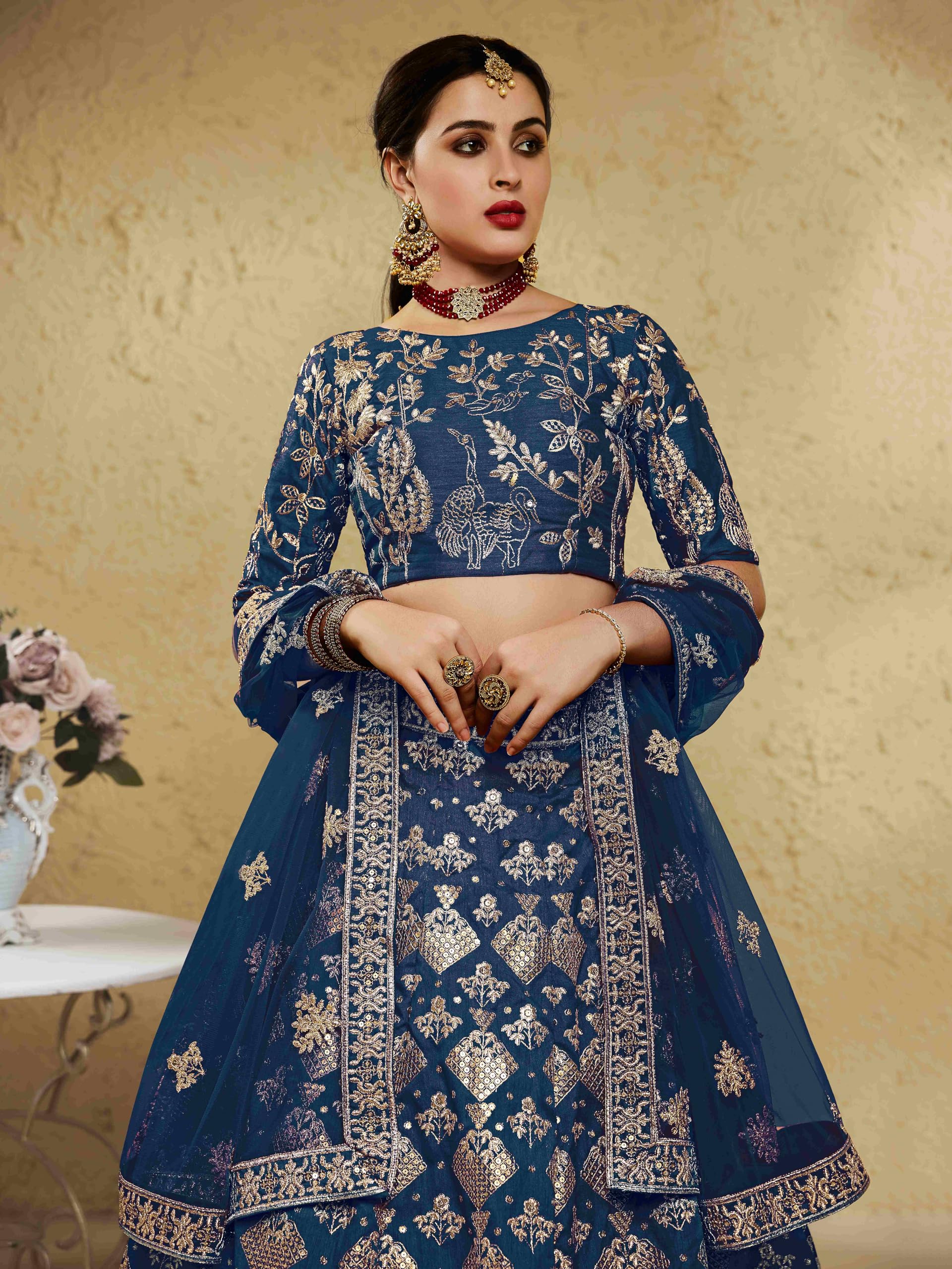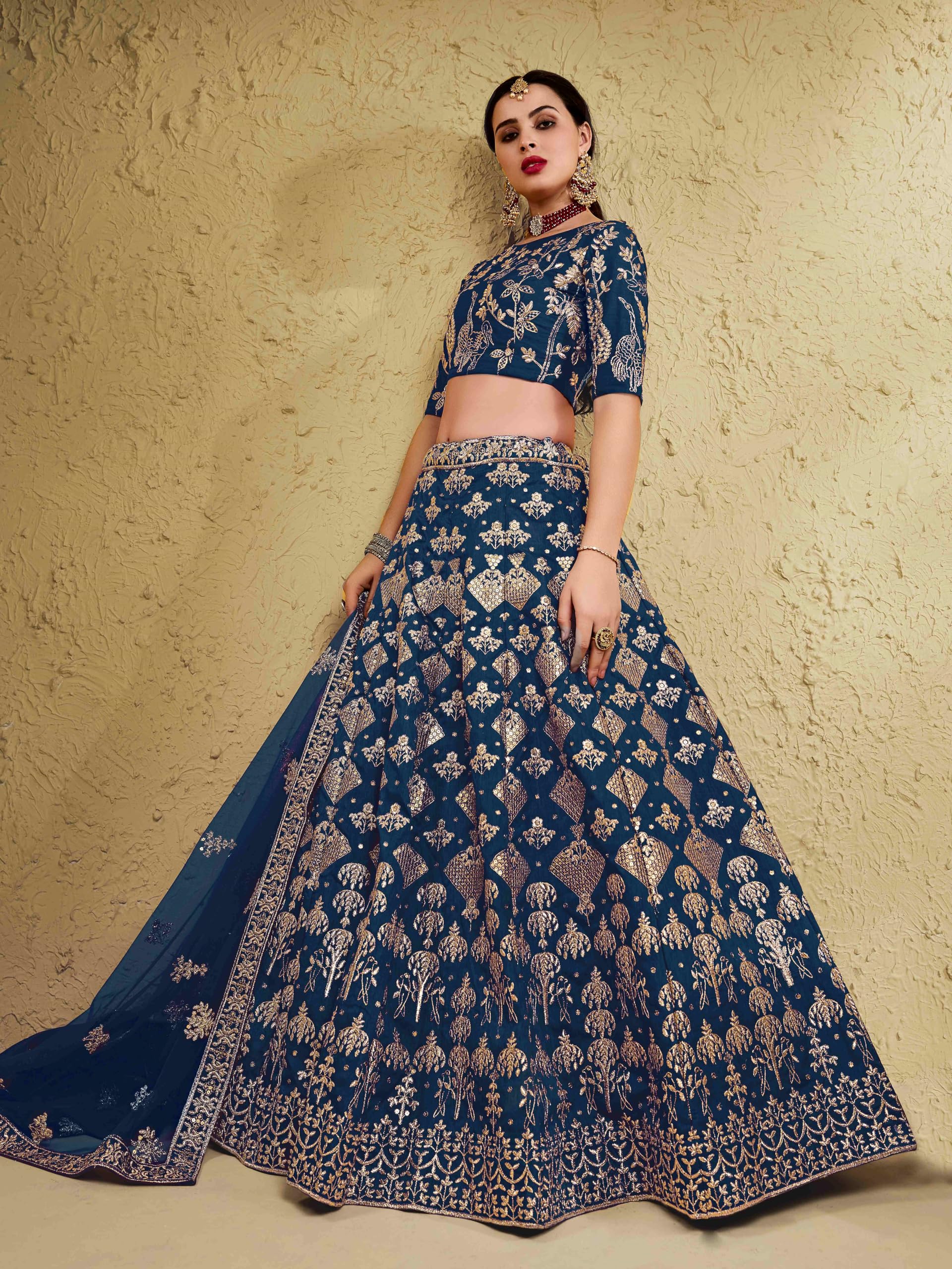 Zeel Clothing Women's Silk Semi-stitched Thread Sequins Embroidery Bridal New Lehenga Choli with Dupatta (7055-Blue-Wedding-Bridal-Stylish-Latest; Free Size)