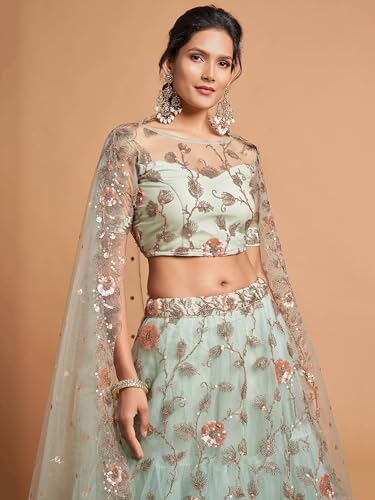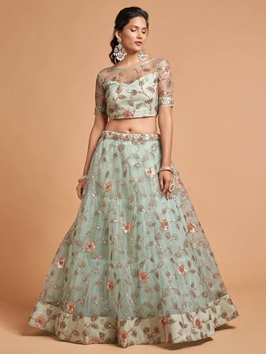 Zeel Clothing Women's Soft Net Embroidered Semi-Stitched Wedding Lehenga Choli with Dupatta (7314-SkyBlue-Wedding-Bridal-Lehenga-Choli; Free Size)