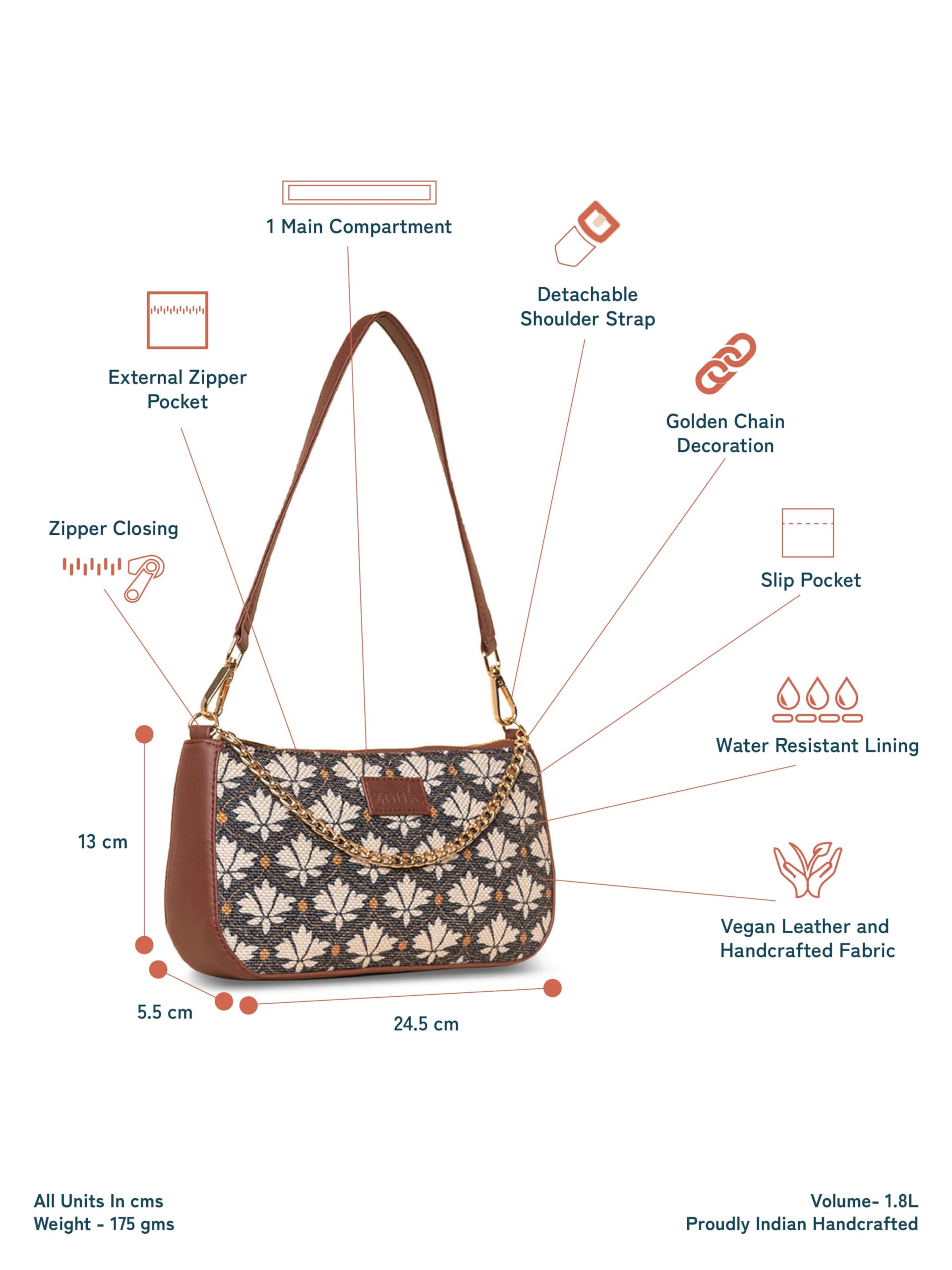 This is a Proudly Indian and 100% PETA approved Vegan mini shoulder bag. This exceptional mini shoulder bag is a versatile addition to your accessories line. The bag is adorned with a gold chain which can be used as a piece of decor as well as carried around the wrist. It also comes with a detachable shoulder strap. It has a main compartment with a zipper closure. One can comfortably store their essentials like make-up, wallet, phone, keys and more. It has a slip pocket on the inside to keep your small belongings safe and handy and a back zip pocket for quick access.