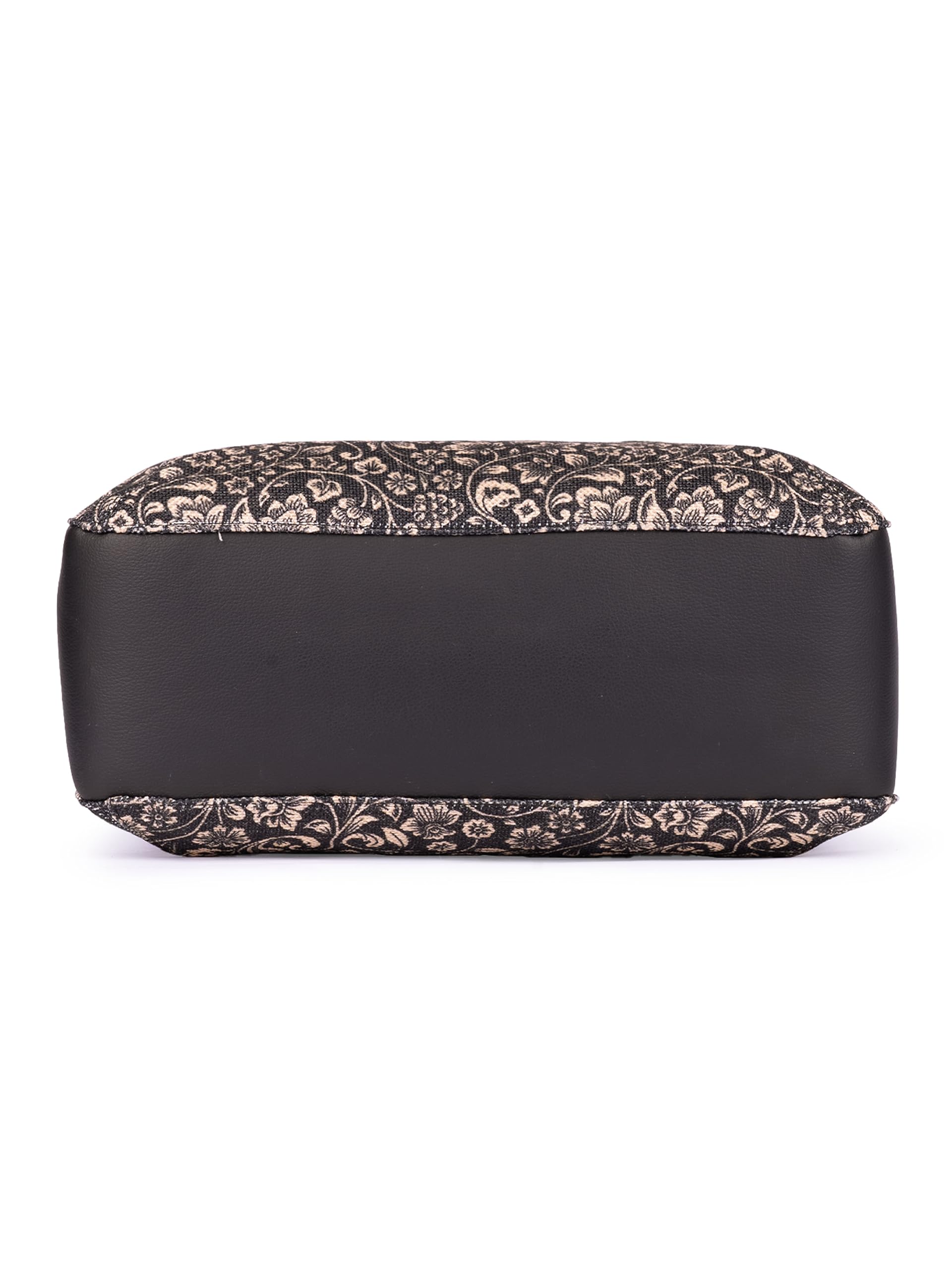 ZOUK Flomotif Floral Printed Jute Handcrafted Vegan Leather Black Women's Satchel Bag | Ladies Purse Handbag | Double Handle Detachable Strap