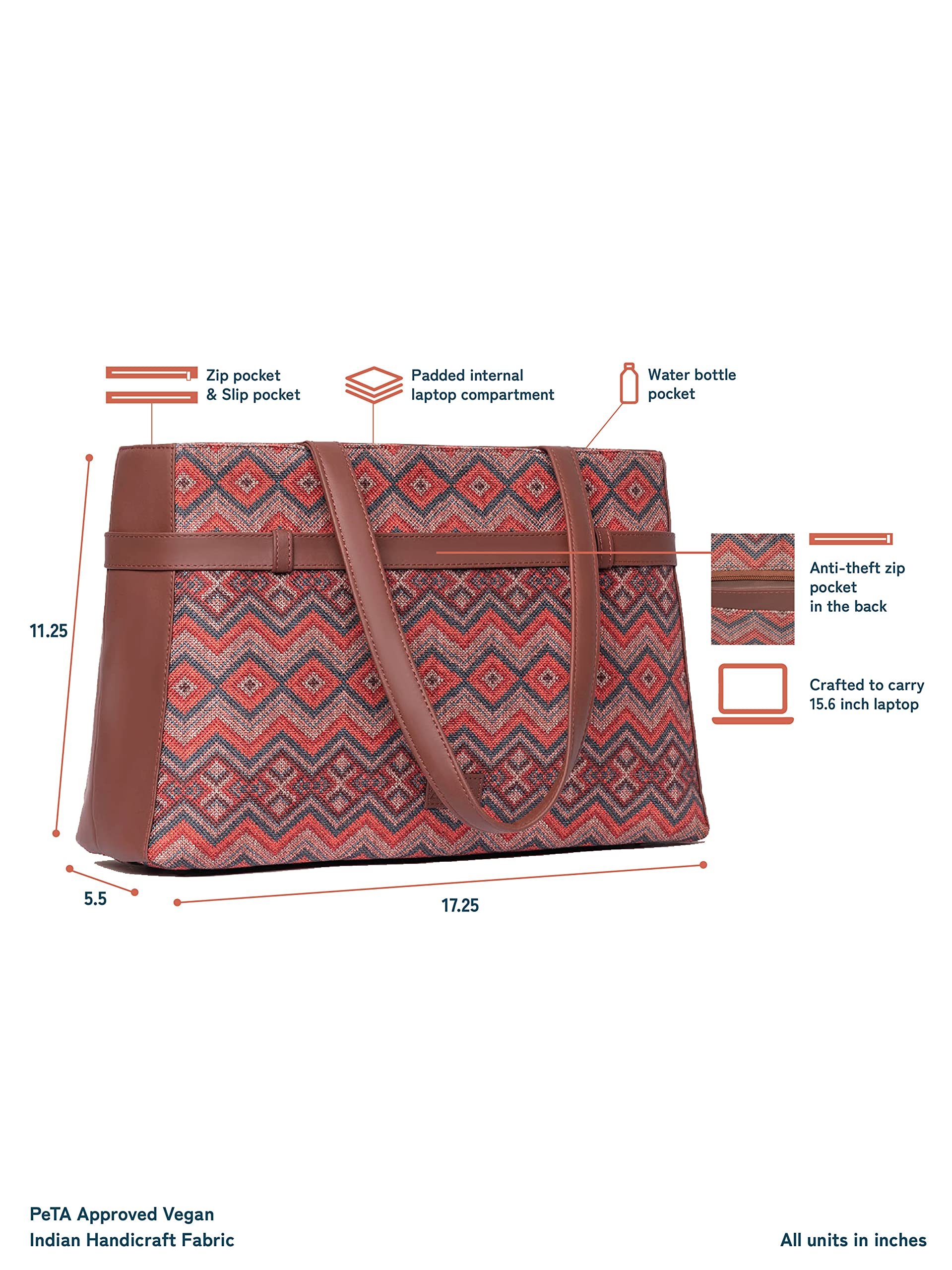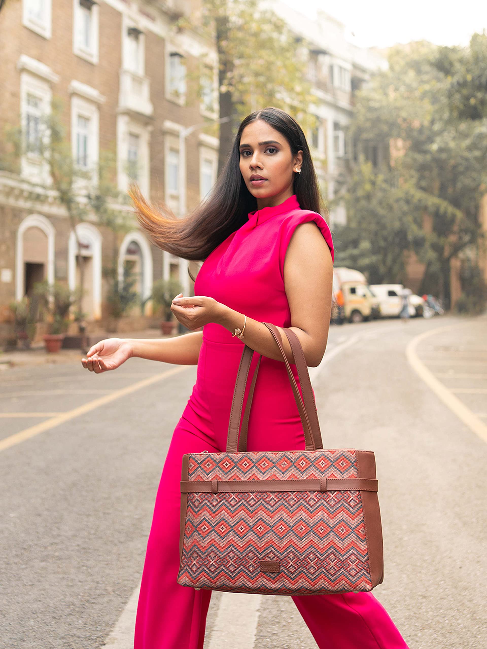 This is a Proudly Indian and 100% PeTA approved Vegan statement office bag, to step up one’s office look. It comes with a padded laptop compartment that can fit up to a 15.6 inch laptop along with a zipper pocket, a slip pocket and a water bottle case on the inside. Double strap handle helps you to carry the bag around conveniently. It also has a back anti - theft zipper pocket for quick access. This bag is not just spacious enough to fit all your office and travel essentials but also elevates your style