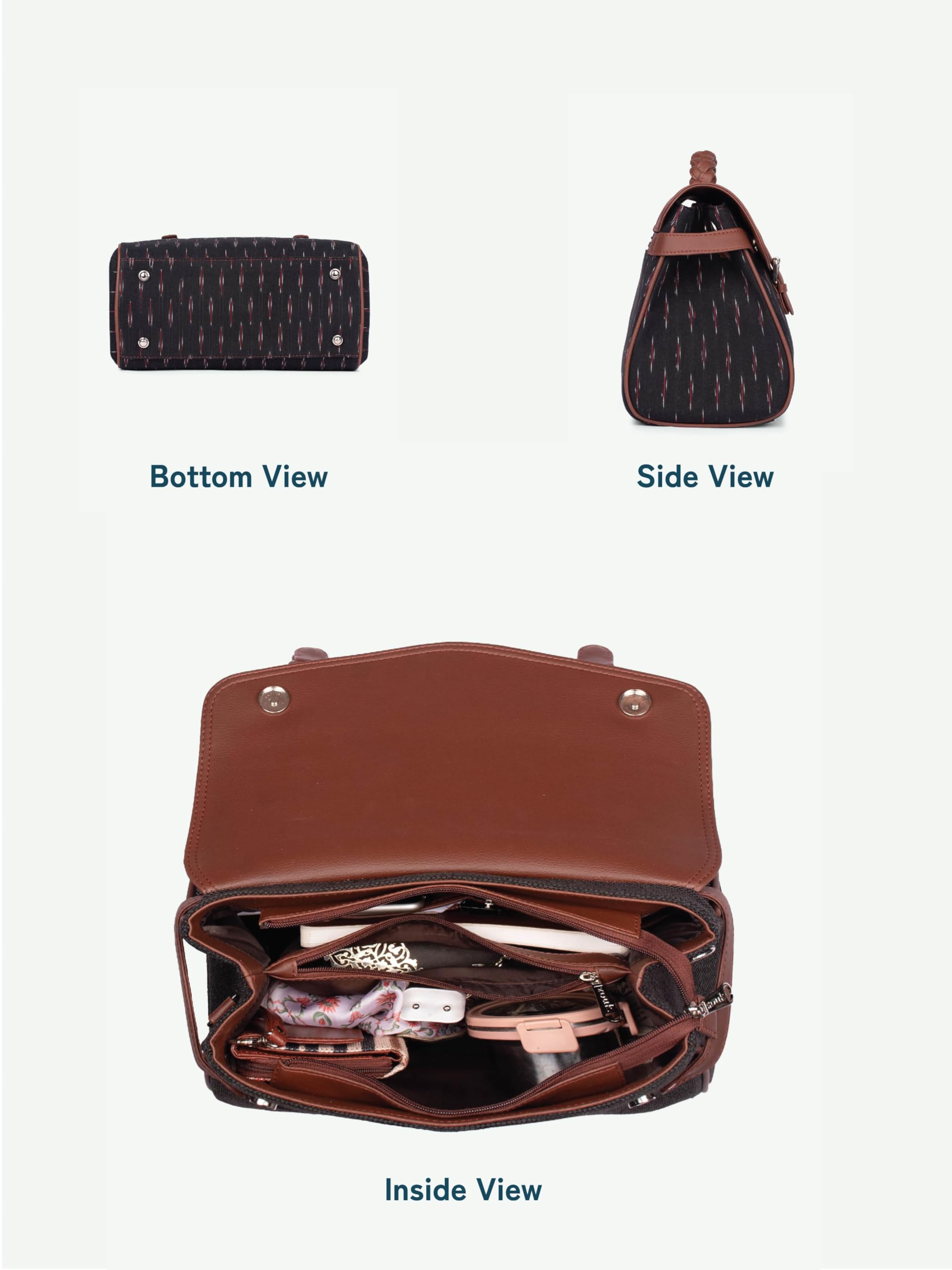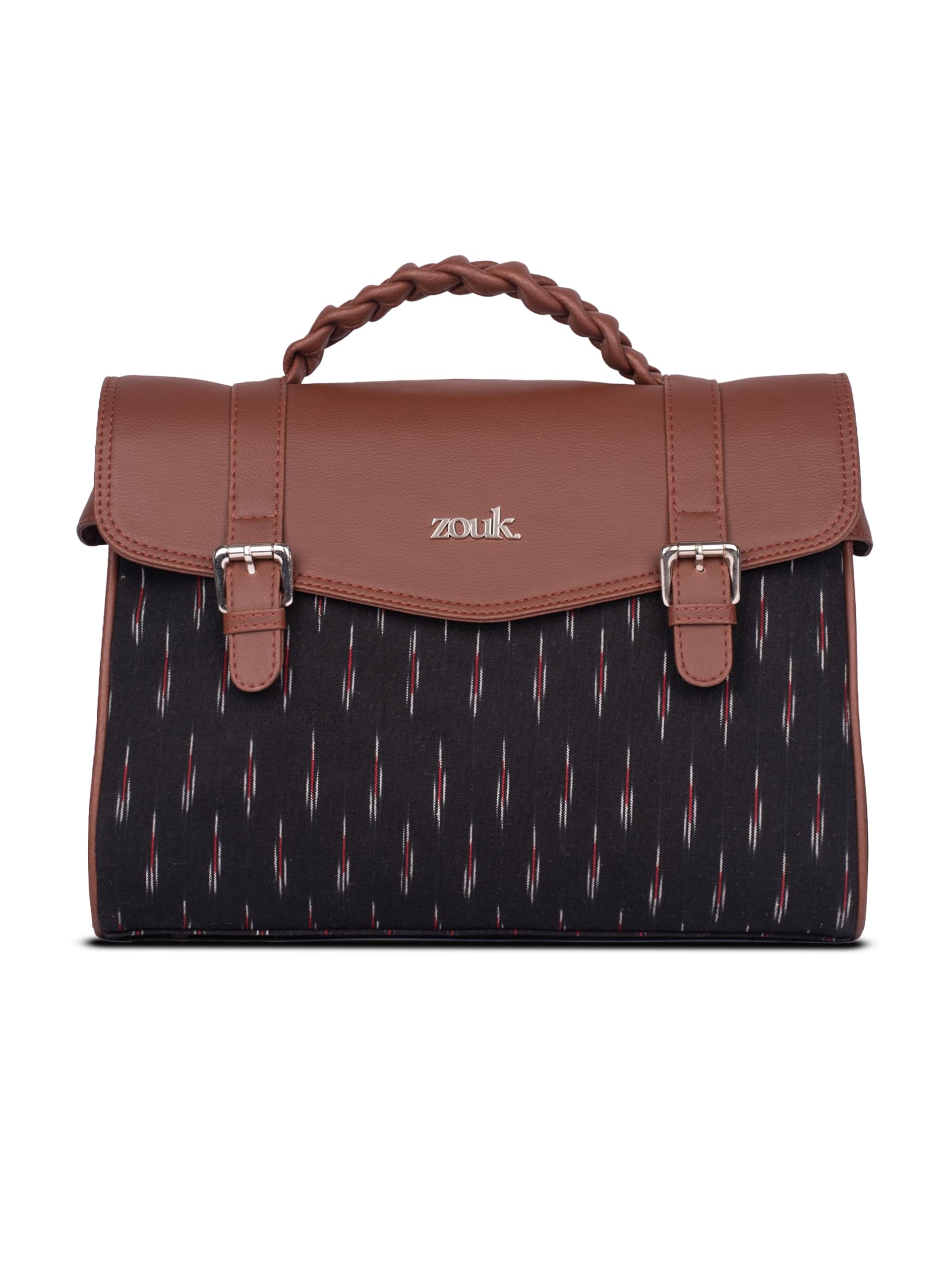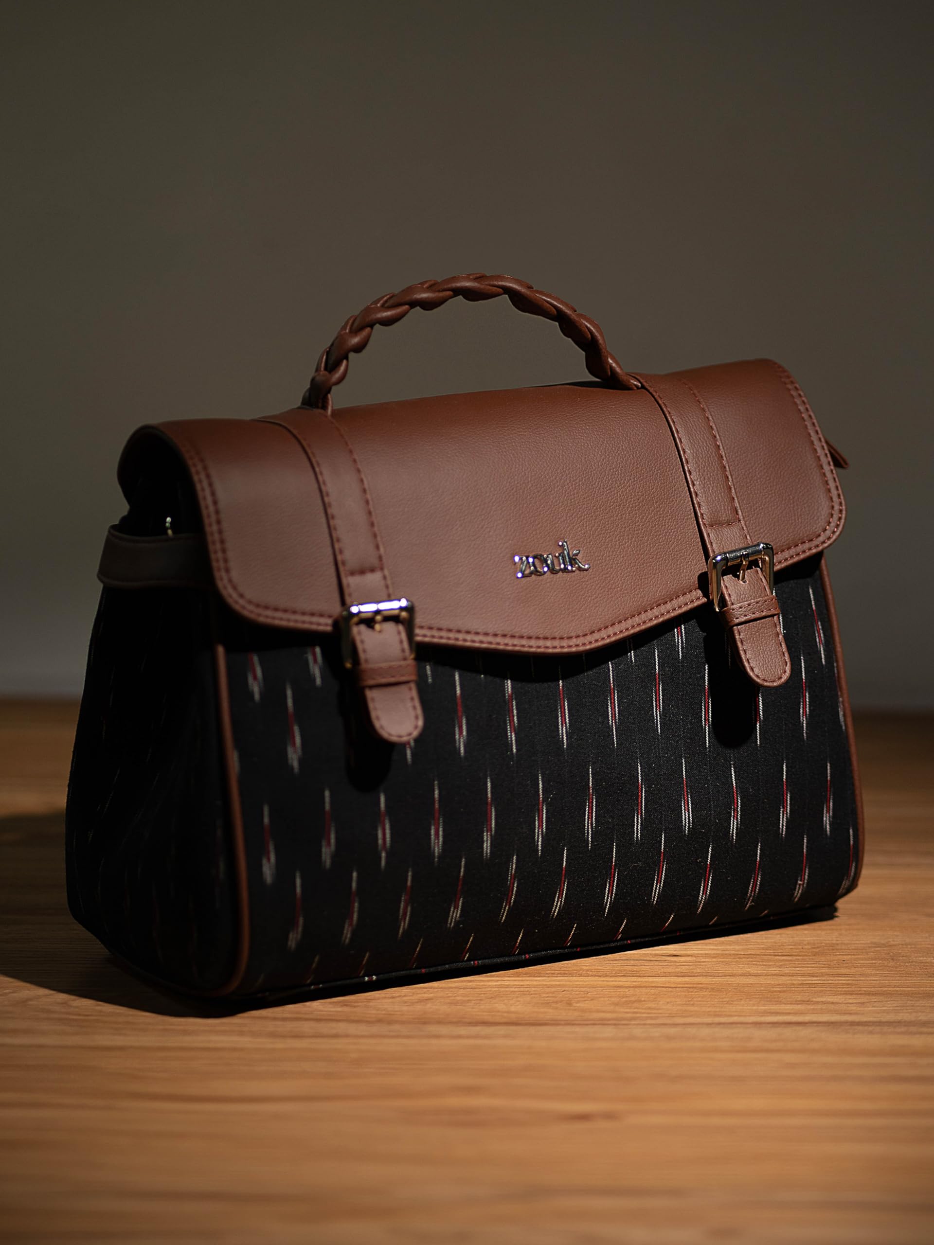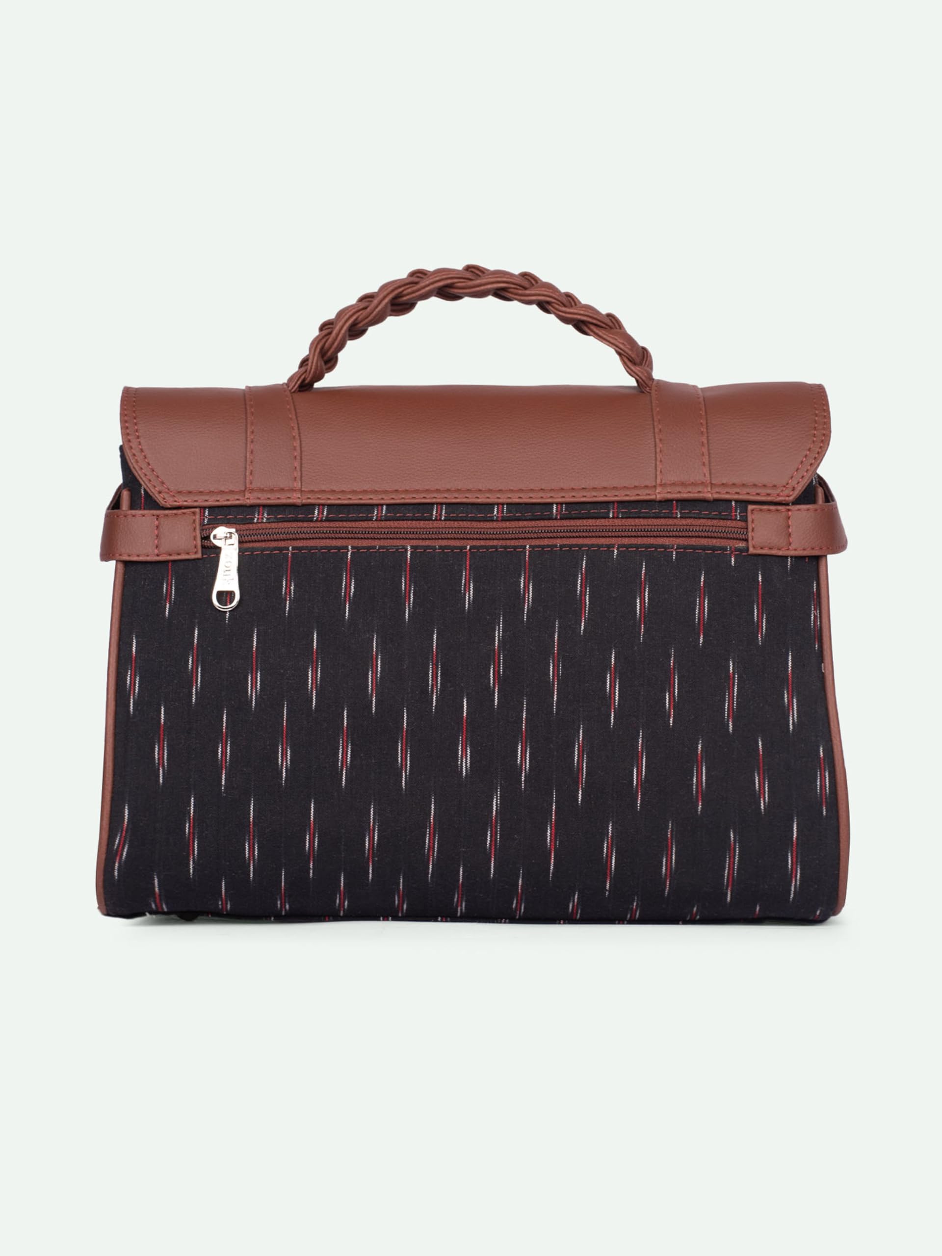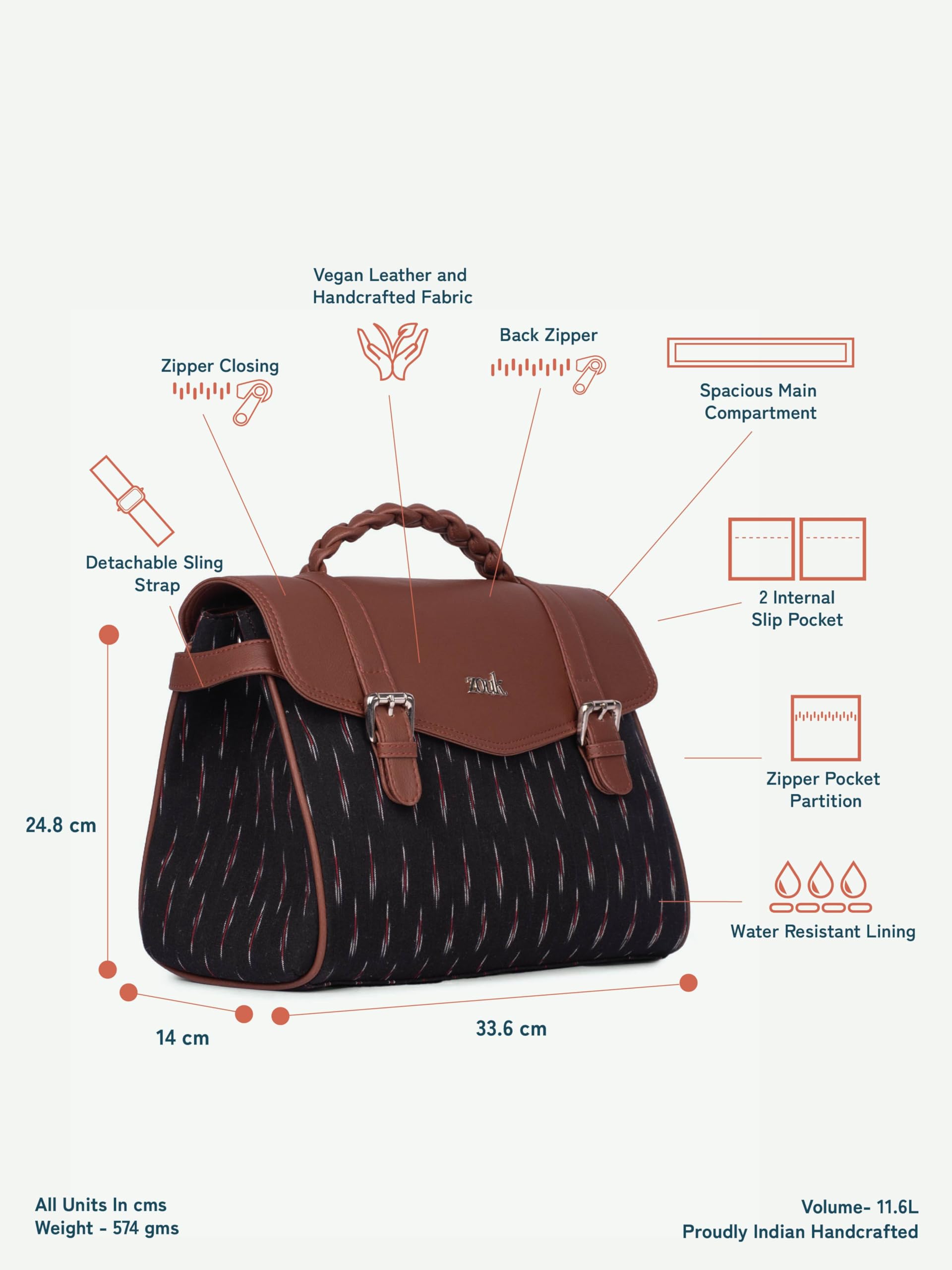 ZOUK Konkona Heritage Satchel Bag - Ikat GreRed | Jute | Vegan Leather Handcrafted With Detachable Sling Strap| Black and Red