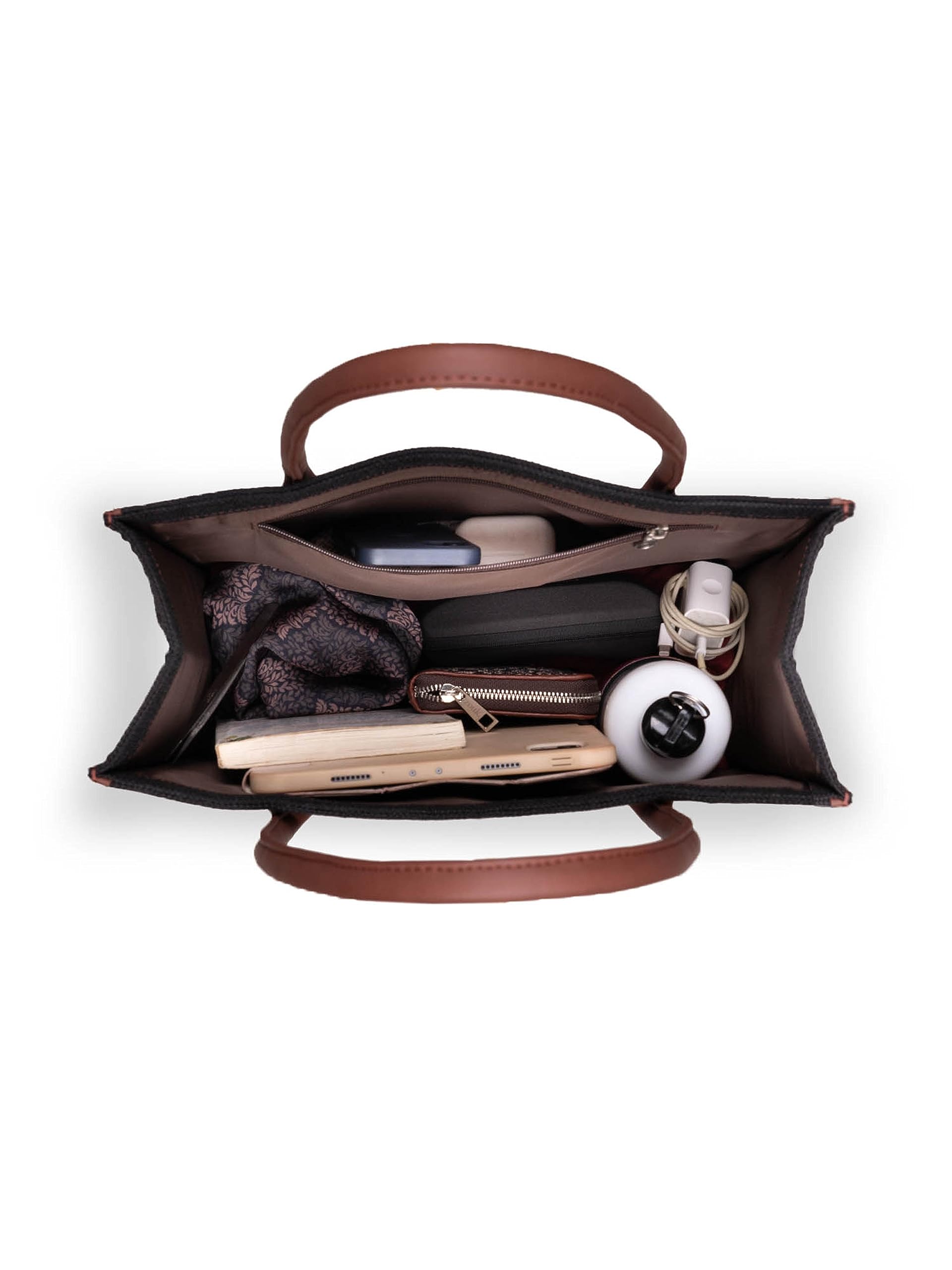 This is a Proudly Indian and 100% PeTA approved book tote,a versatile and functional accessory designed to effortlessly blend fashion and practicality. This unique handbag takes inspiration from the classic book tote design while adding modern elements that make it a true standout.It features a spacious main compartment, providing ample room for your belongings, whether it's your favorite book, a tablet, or everyday essentials like your wallet, keys, and phone. It includes a lining zipper to secure and organize your items. Keep your valuables safe and within reach in the interior zipper pocket.One of the standout features of the Zouk Book Tote Handbag is its foldable gusset. This innovative design element allows you to conveniently fold and store the gusset when the bag is not in use. This is a timeless accessory that can effortlessly elevate any outfit, whether you're going for a casual day out or attending a more formal occasion.