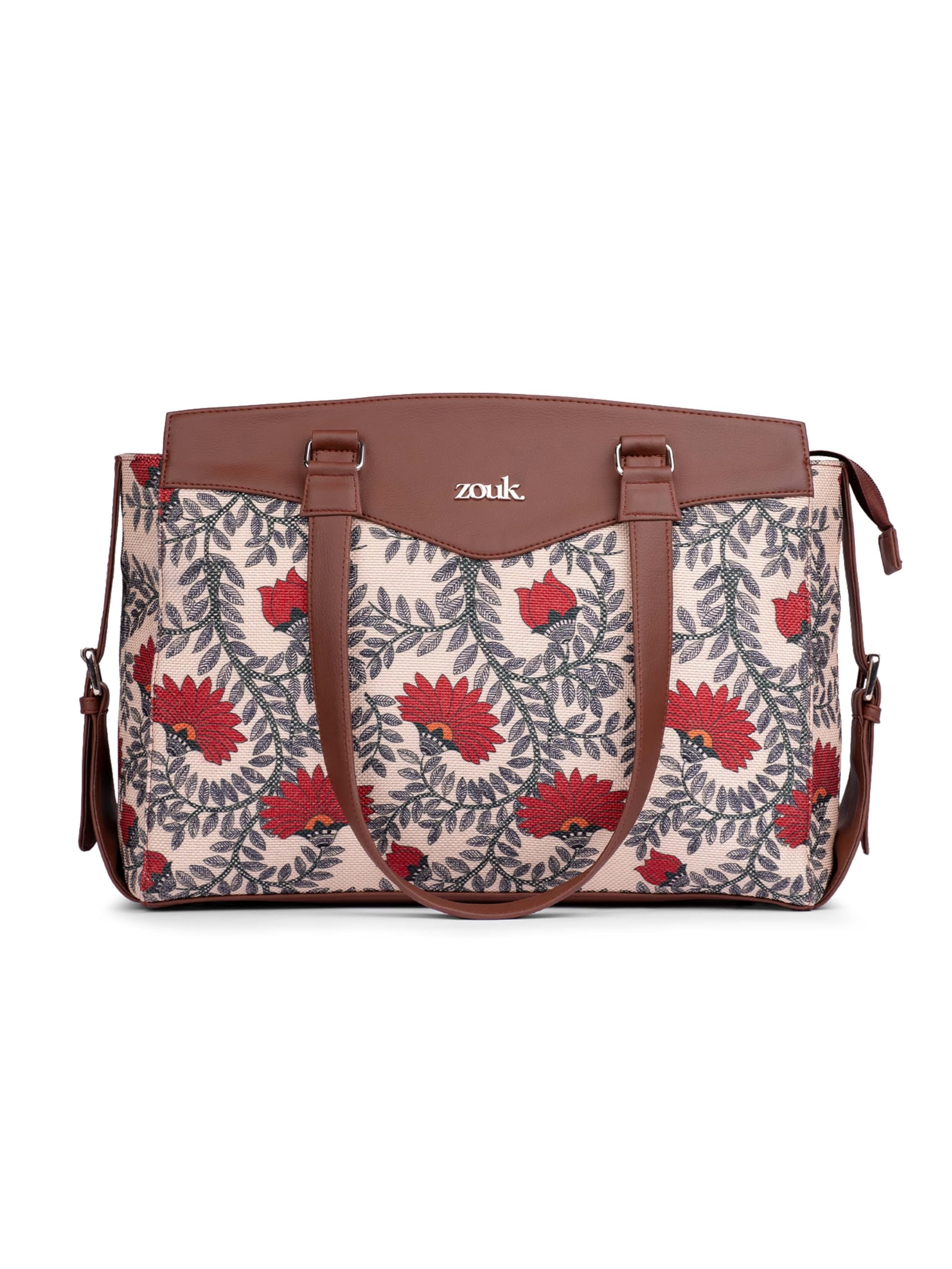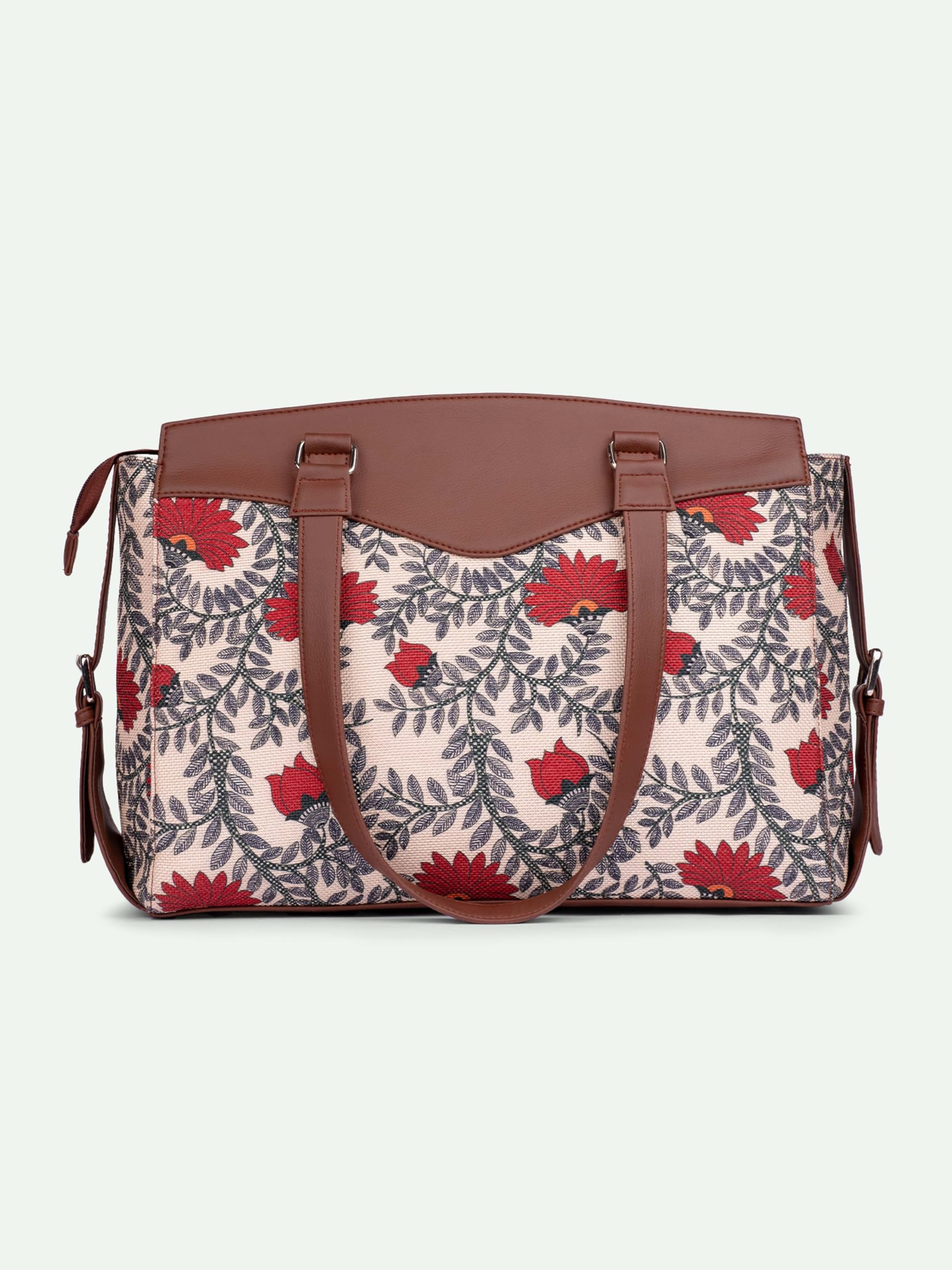 ZOUK Nawabi Couture Floral Printed Jute Vegan Leather Beige and red Women's Office Work Bag With Double Handles Strap