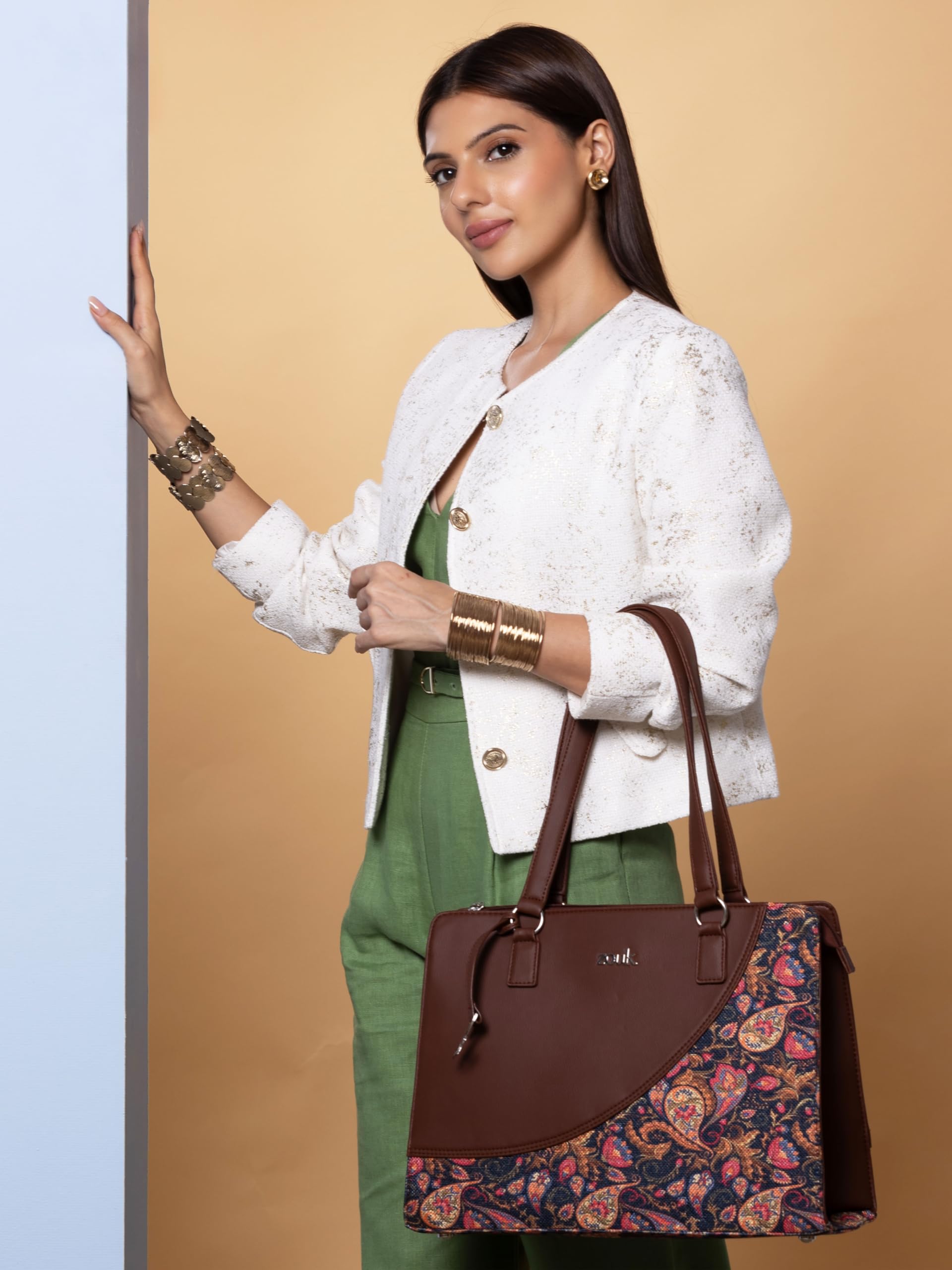 ZOUK Paisley Print Office Essential Bag | Jute | Vegan Leather Handcrafted Tote Bag With Double Handle Shoulder Strap| Pink