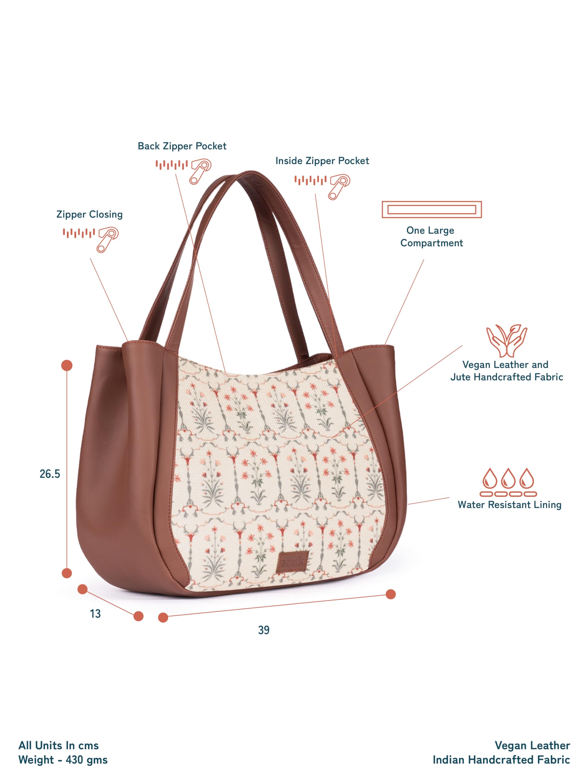 This is a Proudly Indian and 100% PeTA approved Luna handbag. rafted to cater to your daily needs while keeping you fashion-forward, this handbag offers a harmonious balance of space and elegance.Its distinctive shape adds an artistic dimension to your ensemble, setting you apart from all the other bags in your wardrobe. Made to accommodate the demands of a dynamic lifestyle, the Luna Handbag features a spacious interior that effortlessly holds your essentials and more. The interior zipper pocket provides a secure compartment for your valuables, such as keys, cards, or cash. In addition, two slip pockets are strategically positioned to keep smaller items easily accessible and well-organized. It also has a back zipper for quick and easy access